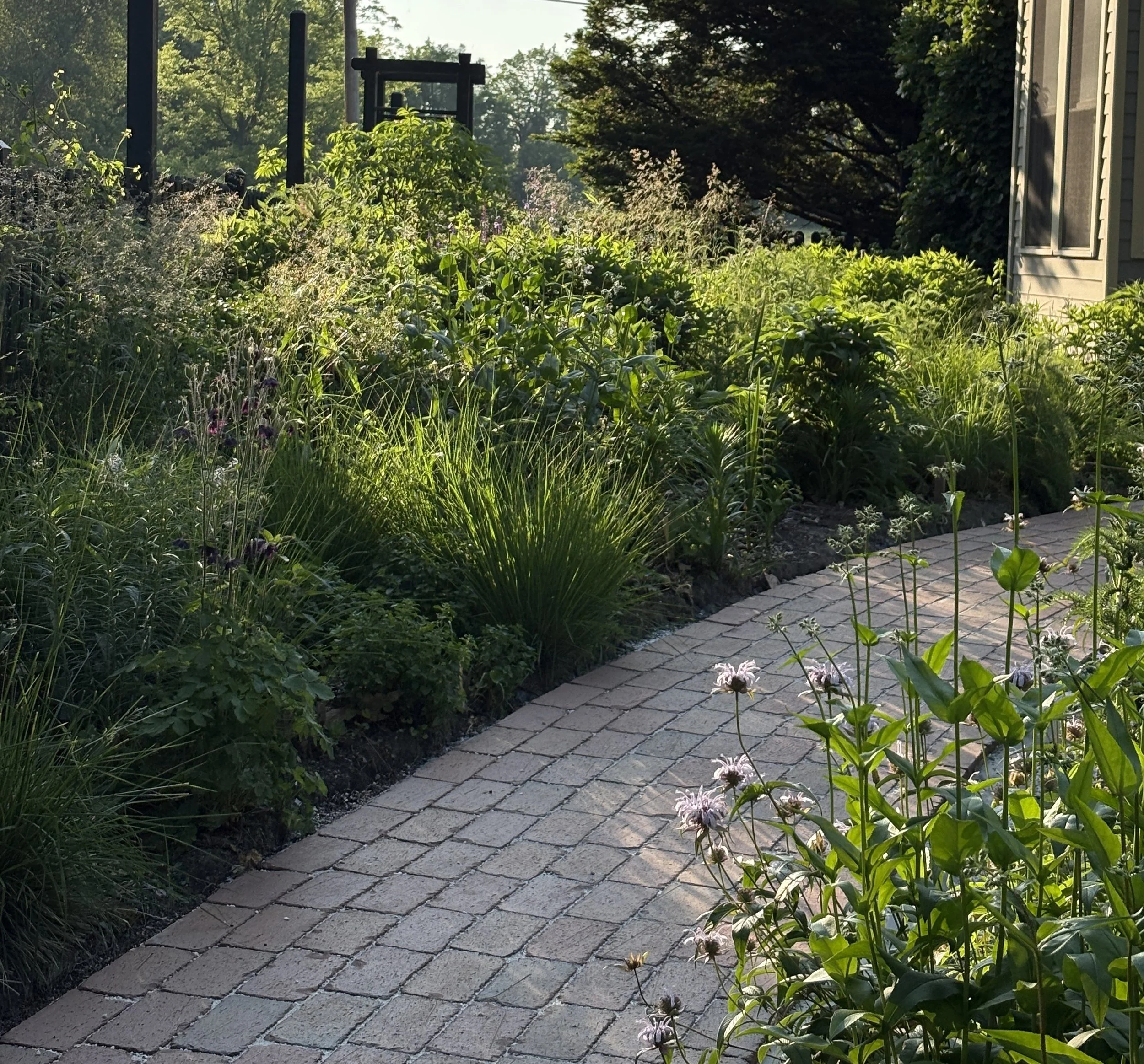 The Mill House Garden blends cottage charm with a contemporary ecological planting sensibility, framing an 1890s home with lush naturalistic borders and a vegetable garden. Broad perennial sweeps replace what was once lawn, favoring native species that provide seasonal color and year-round structure.