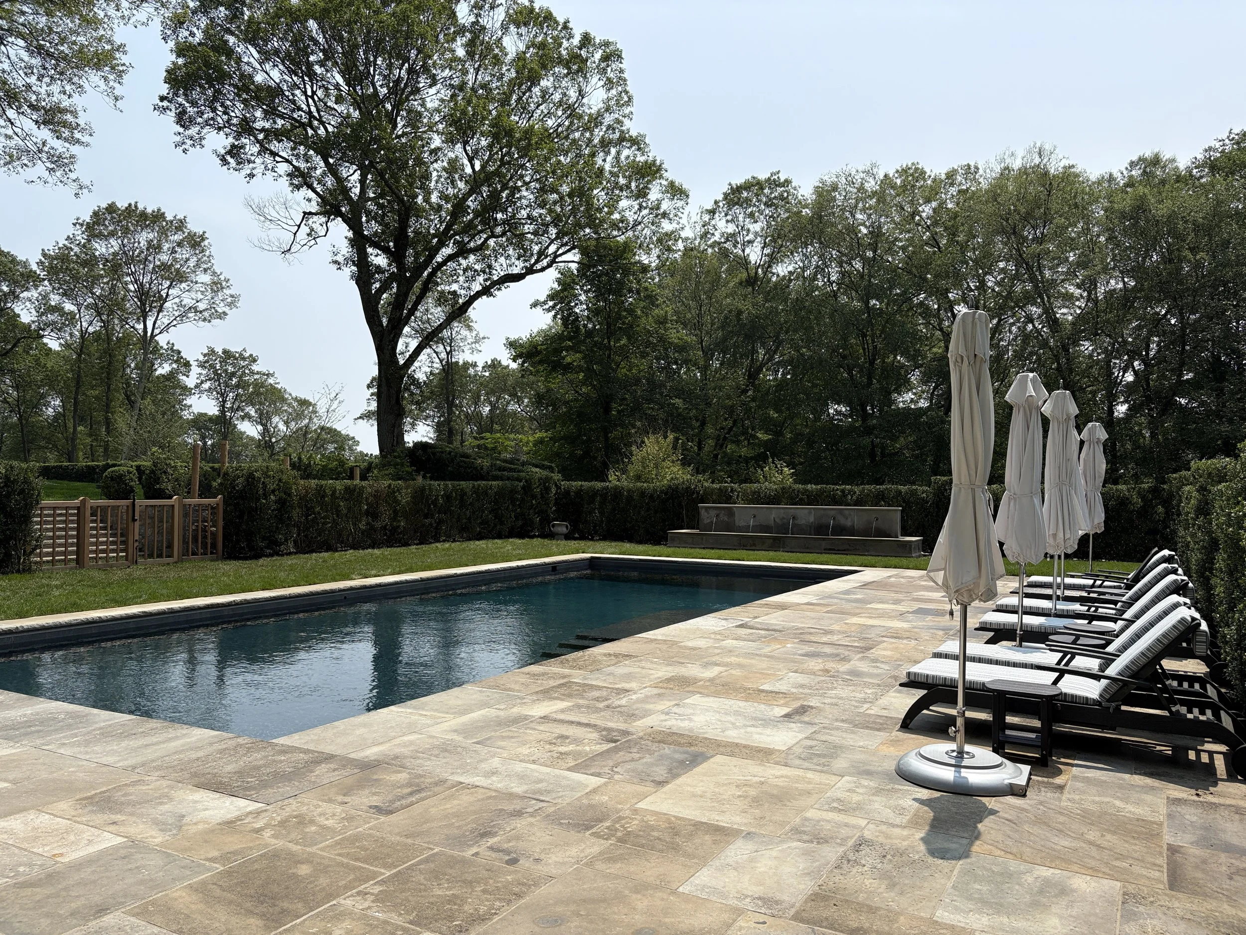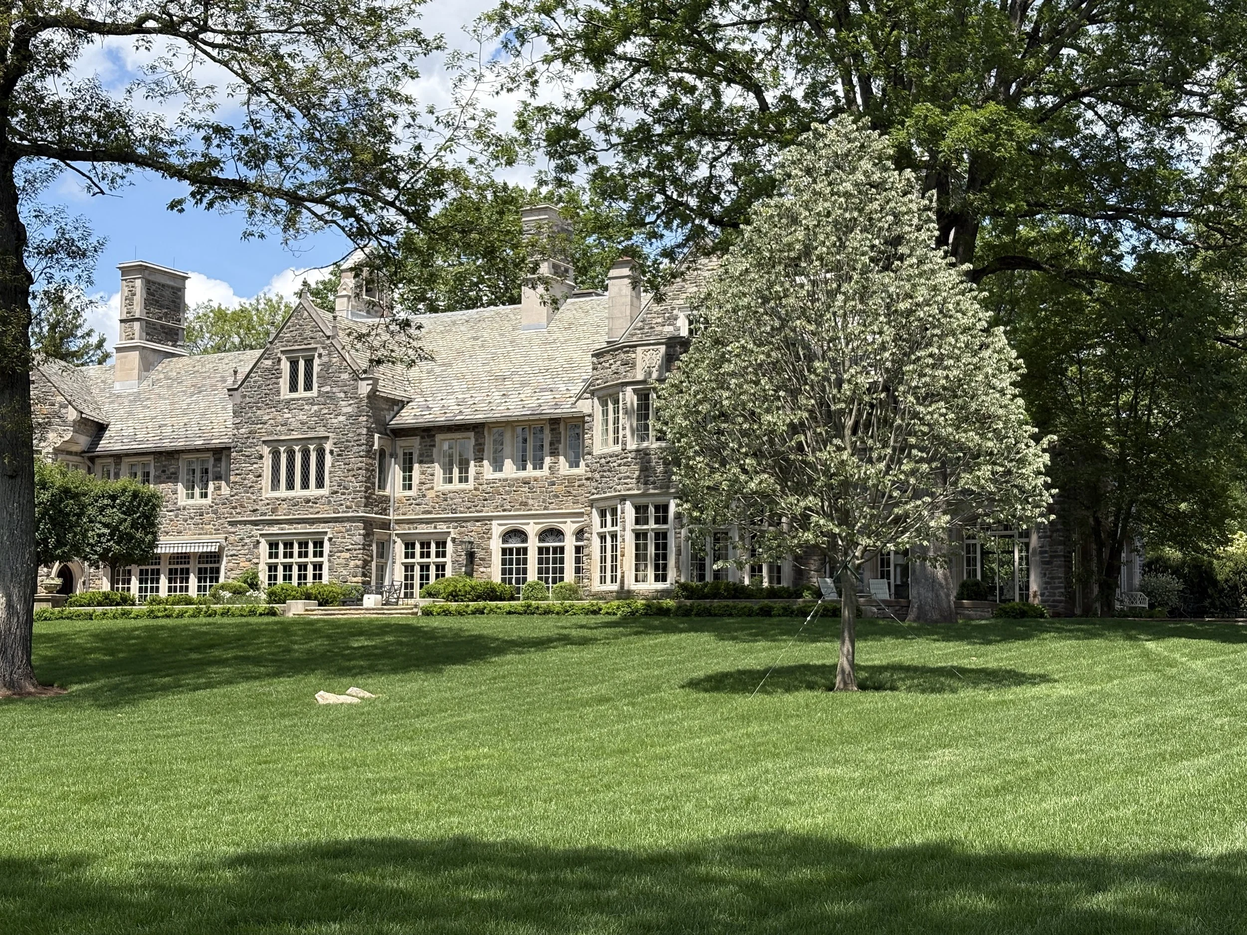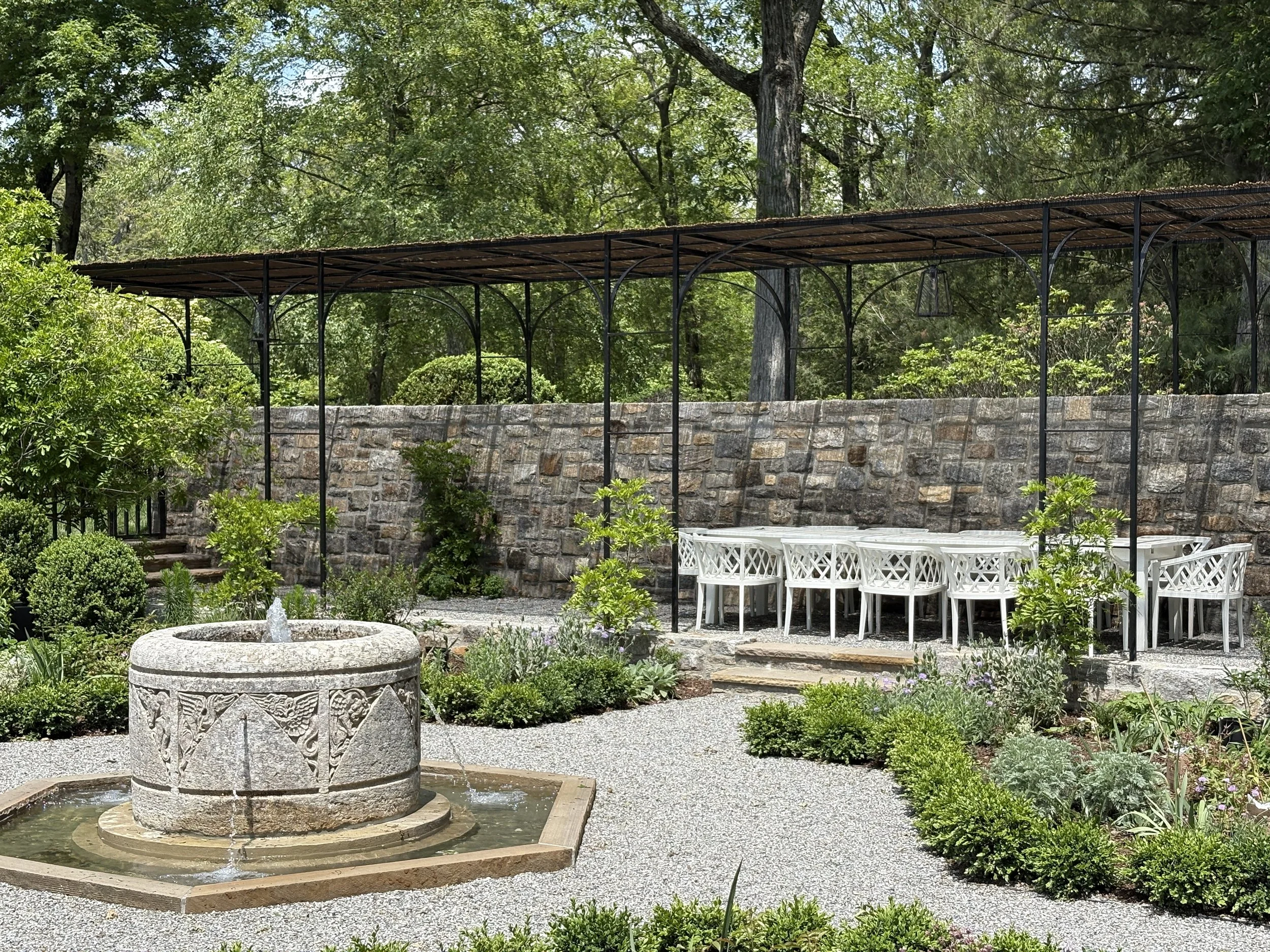 Anchored by a stately 1920s stone house, the design included extensive terrace wall construction to form levels for a pool, hot tub, and formal water garden. Outdoor dining spaces, stroll gardens, woodland trails, a pergola, and tennis court complete the grounds.
