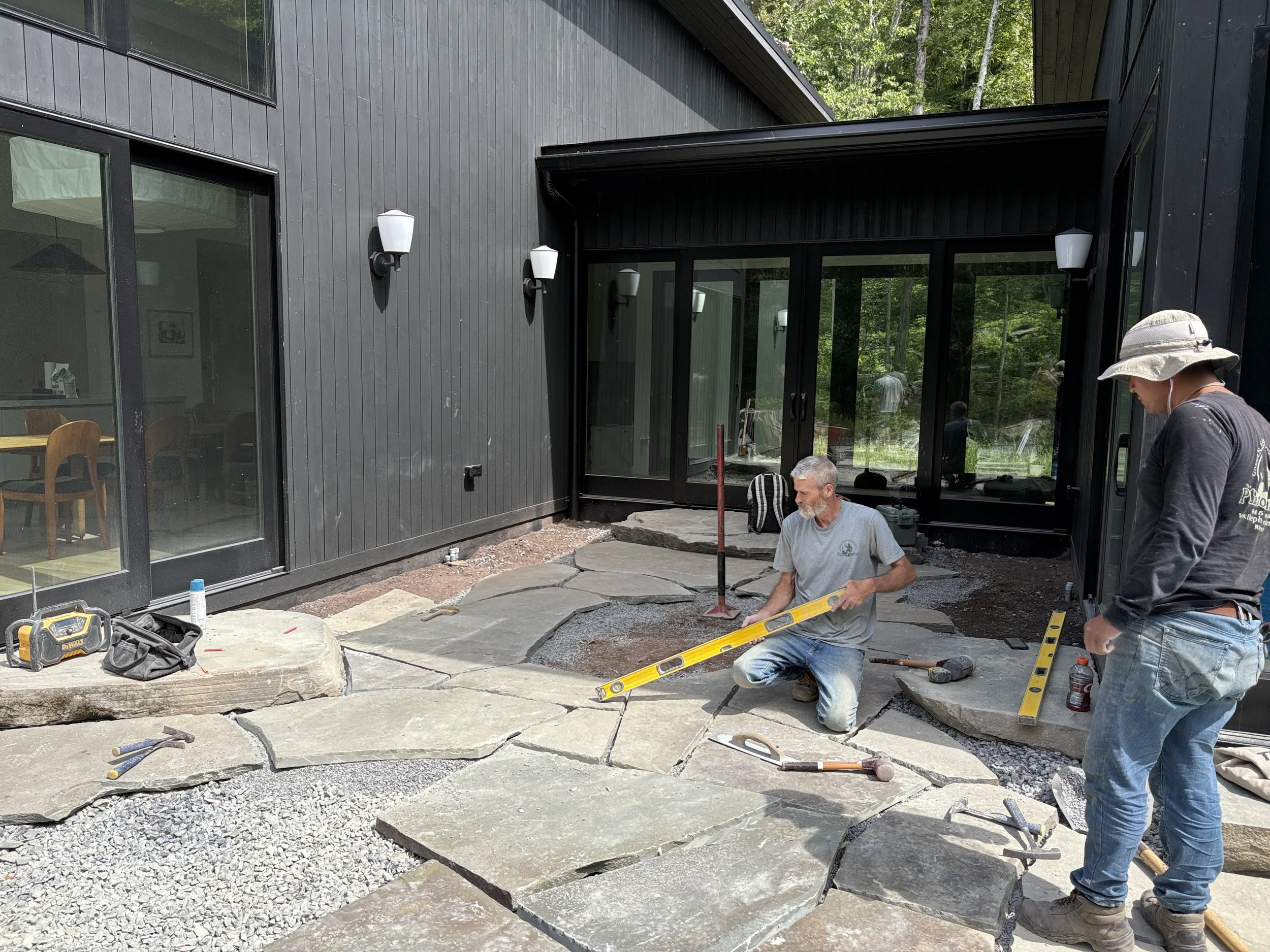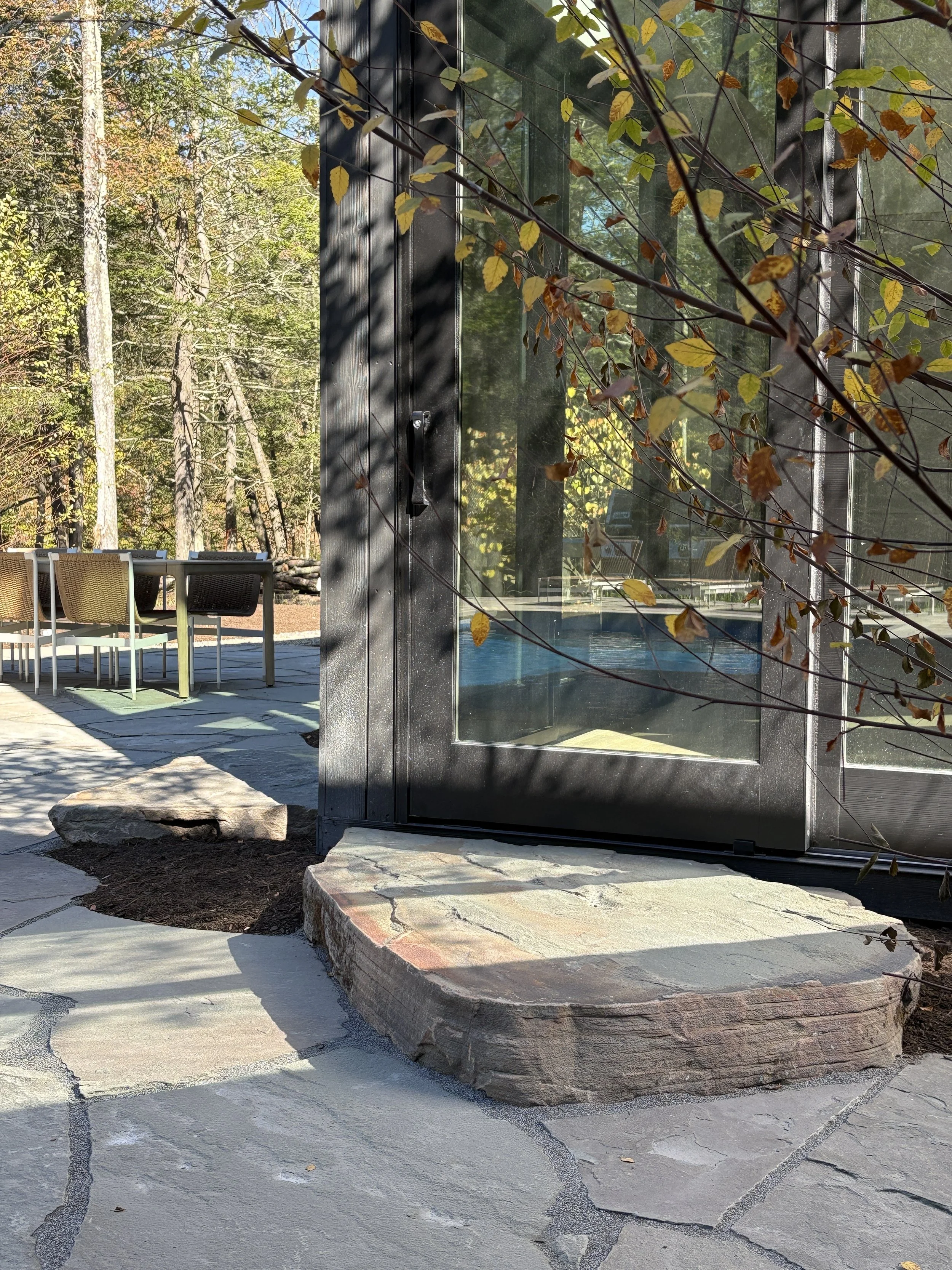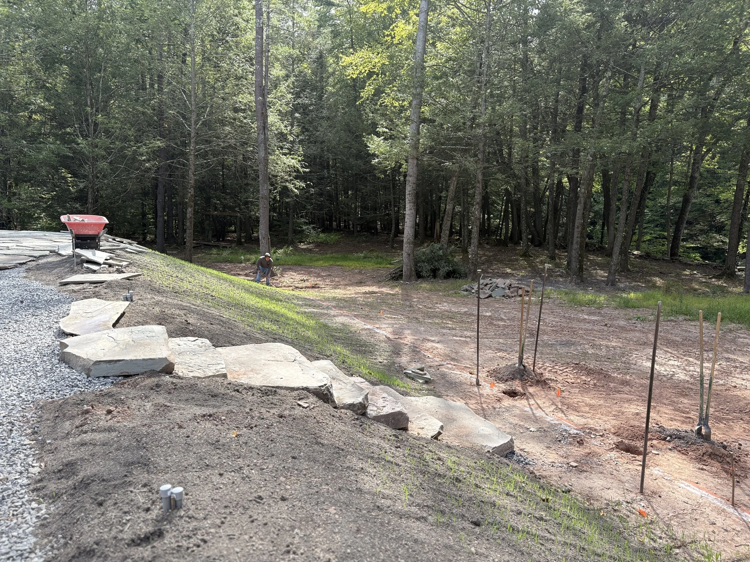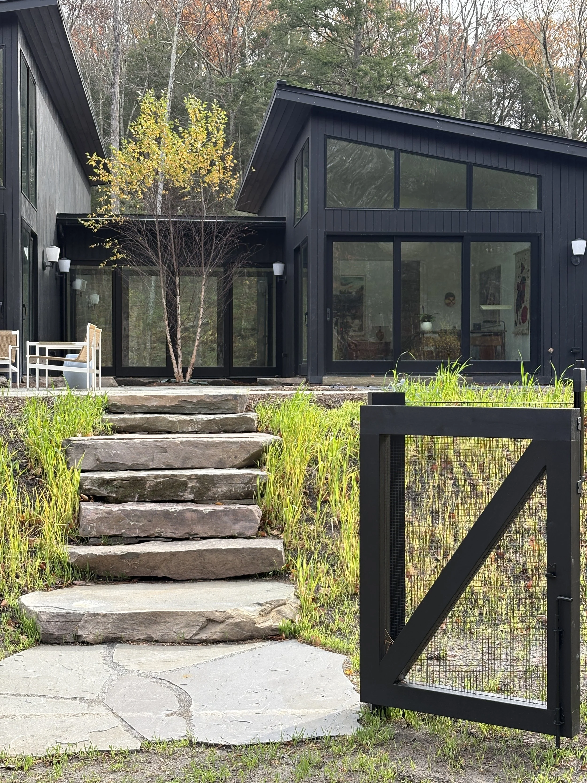 Our landscape plan for a new home along Kaaterskill Creek focuses on repairing the relationship between construction disturbance and the surrounding woodland. Significant earthwork and grading for flood protection had reshaped the site, and our design works to re-establish a seamless transition from forest edge to house. Local bluestone flag paving, natural-cleft stone steps, and native-dominated plantings create the sense that the home sits lightly within the woodland clearing.