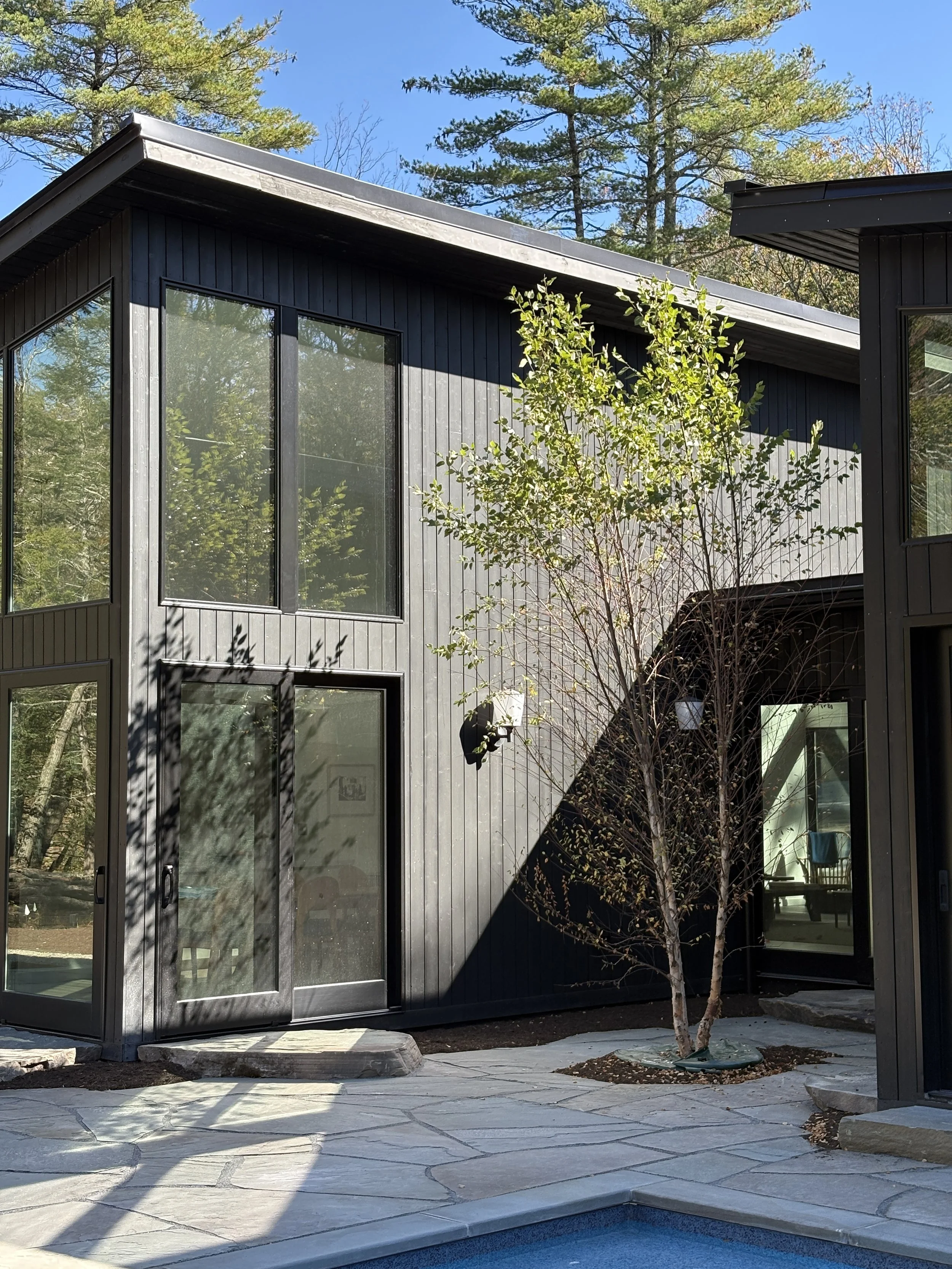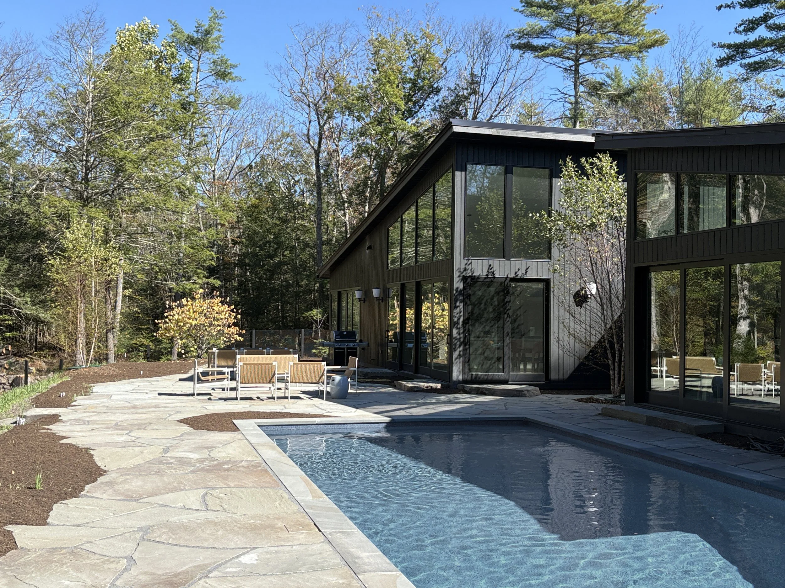 Key features include an entry garden, rear terrace with pool and social spaces, and a seeded meadow. Each element is calibrated to meet the needs of the homeowners while reinforcing a strong visual and ecological tie to the creek corridor and surrounding woods, allowing the modern house to feel quietly integrated into its Catskill setting.