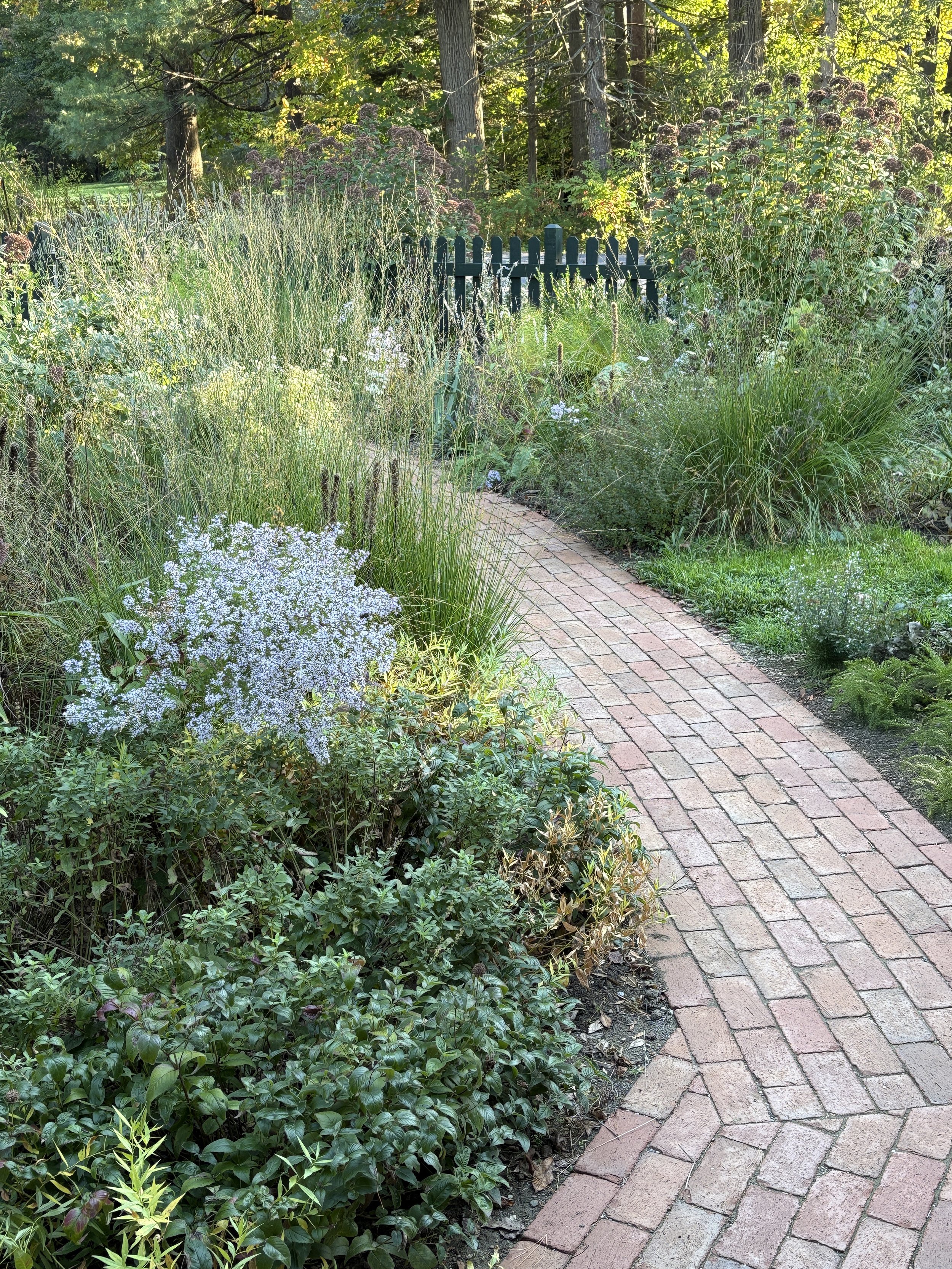 A brick path sweeps through the garden, and circulation is anchored by rustic fencing and handcrafted gates that lend a timeless touch, creating a landscape that feels grounded and subtly modern.