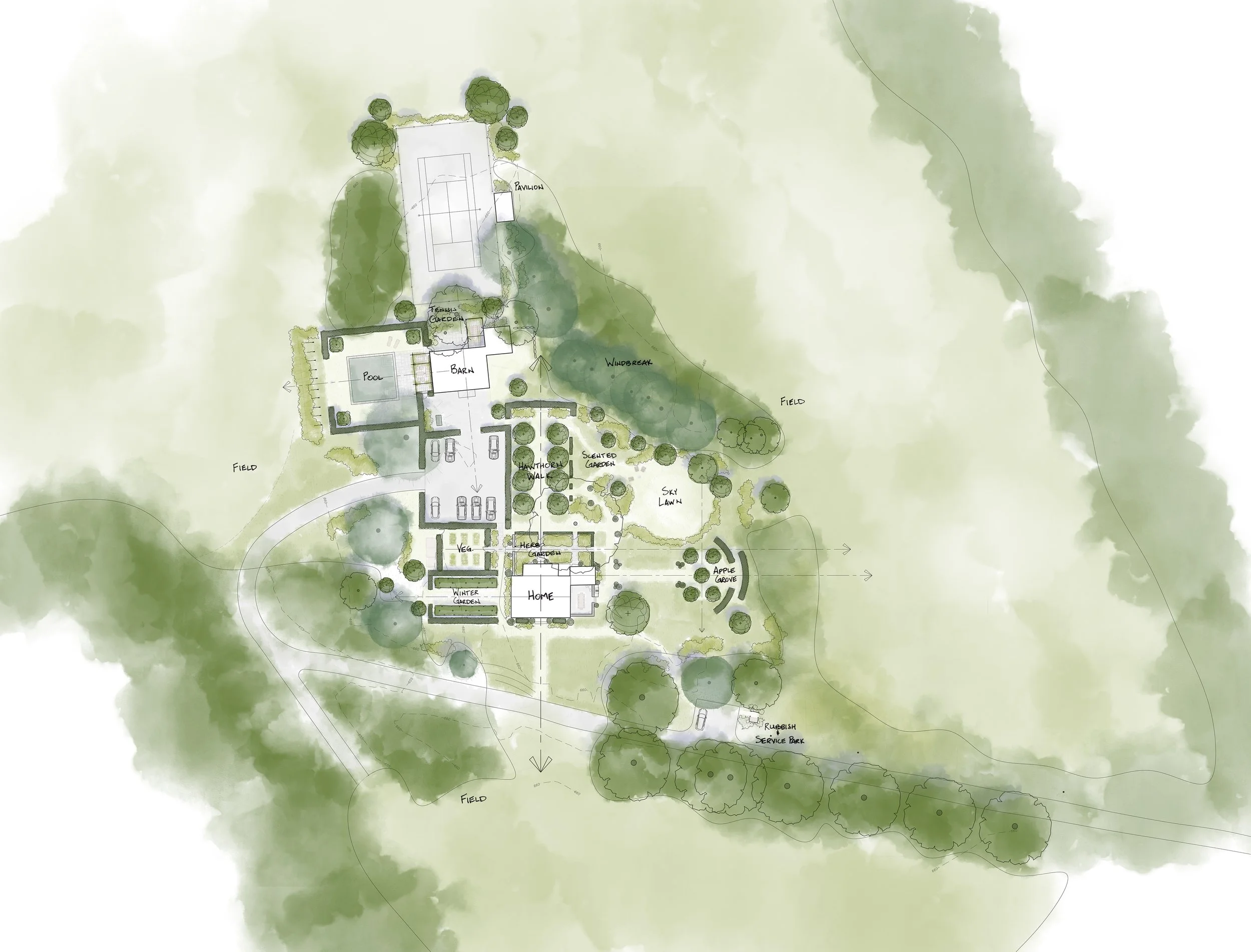 This master plan for a 1762 homestead blends historic character with modern function. Conceived as a lifetime project, the design will evolve to include an informal scented garden and a heritage apple orchard, while a hawthorn allée lends a measured sense of formality.